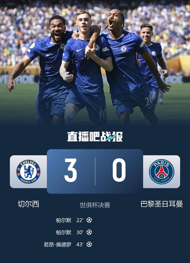 直播吧7月14日訊 北京時間7月14日凌晨3:00,世俱杯決賽,切爾西對陣巴黎圣日耳曼。上半場帕爾默在同樣的位置同樣的角度射門打進兩球,隨后他助攻若昂-佩德羅再下一城,切爾西暫3-0巴黎圣日耳曼;下半場羅伯特-桑切斯貢獻神撲,恩佐傷退,德拉普失單刀,若奧-內維斯直紅,最終歐協聯冠軍切爾西3-0戰勝歐冠冠軍巴黎圣日耳曼,捧起本屆世俱杯冠軍!